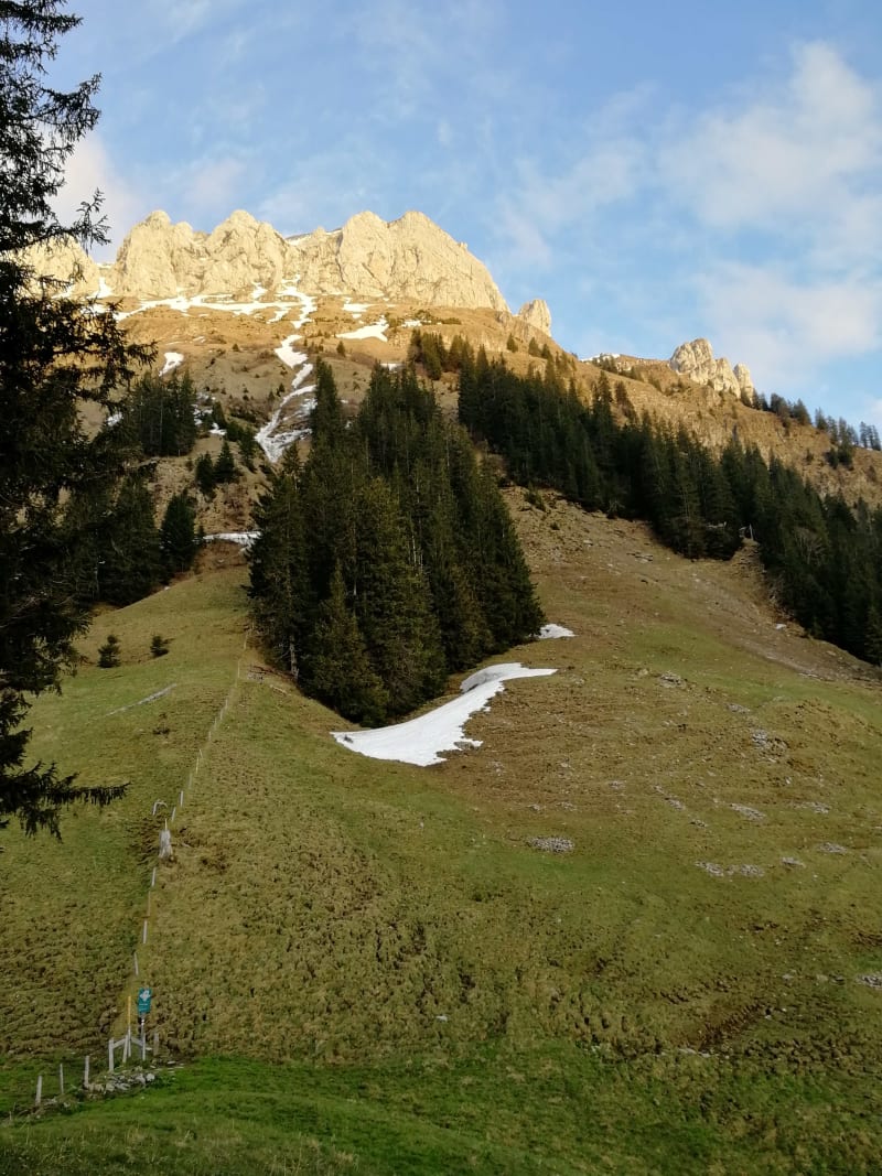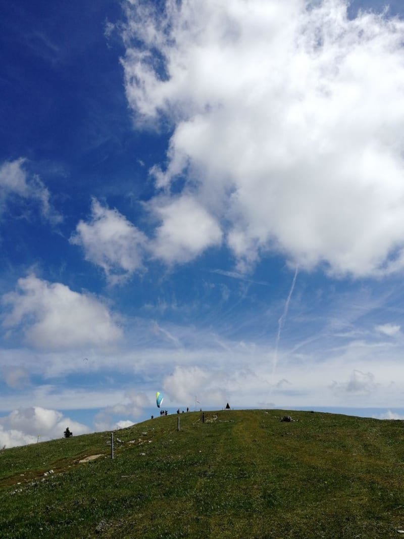 As I was preparing to take off, I was joined by the young local farmer from the farm just below the trees, and a bit later by his wife, they came up for repairing a fence, and we chatted a bit (thankfully they spoke really good french, as my german is close to non-existent). Such simple life surrounded by amazing scenery! I’m not sure I could adapt to this lifestyle, but makes you ask yourself questions like how little of the modern “musts” are really needed in order to have a meaningful and happy life. As usual when I meet people during vol-biv, they were impressed that you could do that with a paraglider (people usually see it as a boring sport where you loaf around one hill and then drink beer), and the concept of flying far and then camping out and flying on the next day brought twinkles in their eyes 🤩 But it was time for me to move on, and with a relatively low confidence of managing to stay up, I took off.