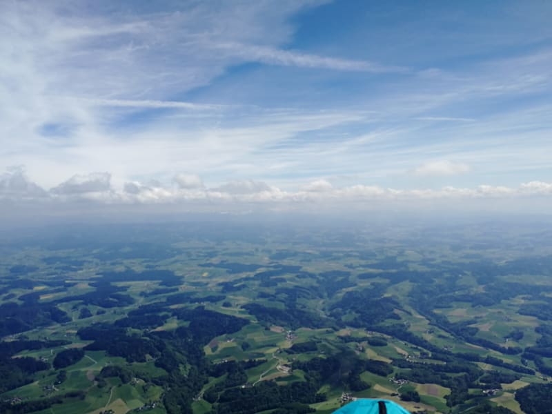 Today finding the thermals was easy. There were nice cumulus clouds dotting the landscape everywhere, each formed by a thermal. So it’s just a question of gaining enough height under one cloud, and hopping over to the next one without losing all the altitude, and hoping that it’s still ongoing by the time you get there. Thermals usually go in cycles, and if you reach a cloud just as the thermal cycle finished, you will only find sinking air! You can often see this cycling if you look at a puffy cloud: sometimes it completely disappears (sinky air!) just to reappear at the same place 10 minutes later (good climb!).