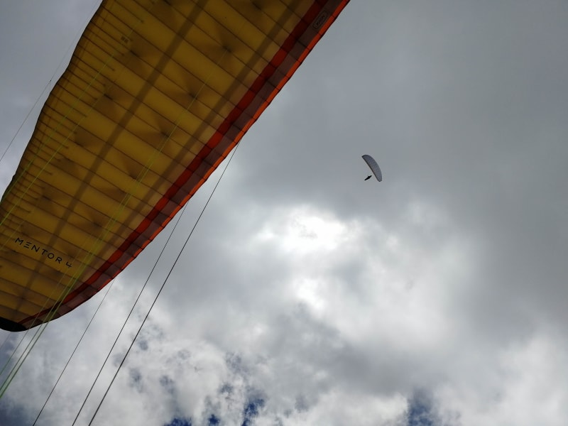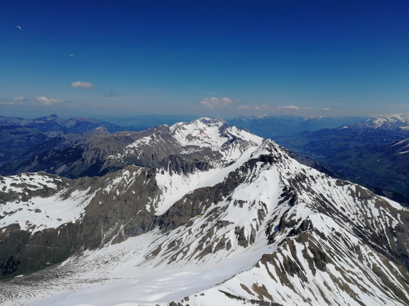 Plans made and radio contact established, we take off one by one, except Vio who will continue along the ridge to cross over until Wispile (for what turned out to be a surprisingly snow-challenged hike 😅). We all manage to climb out, except Tommy who takes off in a bad cycle and has to fight to stay in the air. After a while Jocelyne and Jean-Phi take off in direction Wispile, I wait for Tommy who has found a good thermal and is slowly but surely climbing up.