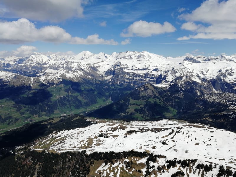 We start by a 2h hike to Mülkerblatten above Lenk, it’s quite warm, summer is officially here! Just before arriving at the top, we see two paragliders take off, the first one goes into orbit immediately, while the second one struggles a bit, but manages to climb up as well. Always reassuring to see others managing to stay up before you launch!