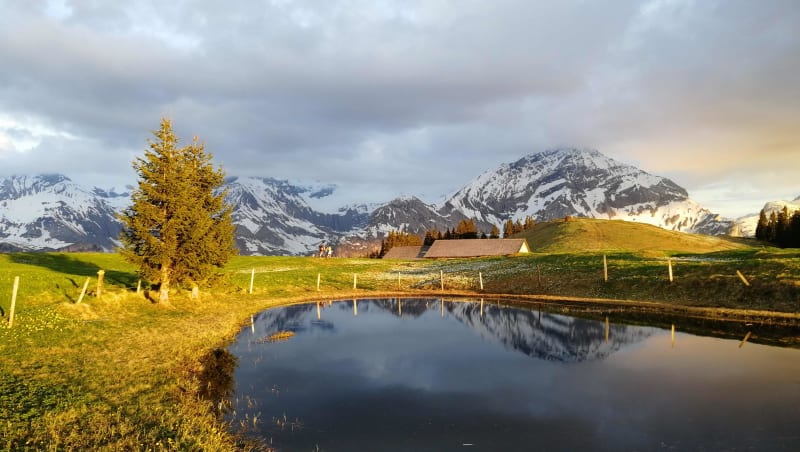 We pack our stuff, leave everything in a nice spot we found for spending the night, and go down the hill to the village of Lauenen in order to accompany Vio on the last uphill hike. We’re fairly well synchronized, she arrives there just 10 minutes before us. A good weissbier in the only restaurant open, and we hike up to the top of the ridge. We arrive 1h later, just minutes before the sunset. Amazing colors in the sky, and with the fields of crocus, it makes for a really nice atmosphere!