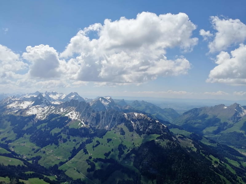 Then starts the “fun” part, going in the direction of home. There is some West wind fighting against me, and I don’t know the region so it’s quite a struggle, often finding myself low in quite turbulent conditions. I’m flying on the sunny south side of the Gantrisch range, and I feel a north wind coming over the ridge (turns out it’s a known phenomenon, it’s generated by the heat low in the Alps drawing air in from the plains), which makes for some turbulent lee side moments. I would probably have been better off flying on the N side, but as they say, hindsight is always 20/20… But slowly I manage to progress, until around Reidenbach north of Zweisimmen, where I get super low and decide to go land. However, just as I go towards my chosen landing spot, I feel a weak thermal, and I start circling in it. And it works! Veery slowly, but surely, it gets me up to 1900m and I can continue again. A few minutes later I’m at cloudbase, at 2600m, flying towards the pictoresque Gastlosen ridge famous for rock climbing. But my elation will be short-lived, as just minutes later I’m forced to land before even reaching the Gastlosen; I managed to “waste” 1500m of altitude in less than 15 minutes :) Landing seems a bit tricky with abundant power lines, cables and forests, but I find a sizeable meadow and take the time to make a good approach, and while I surely needed all my concentration, the landing was easy and safe.